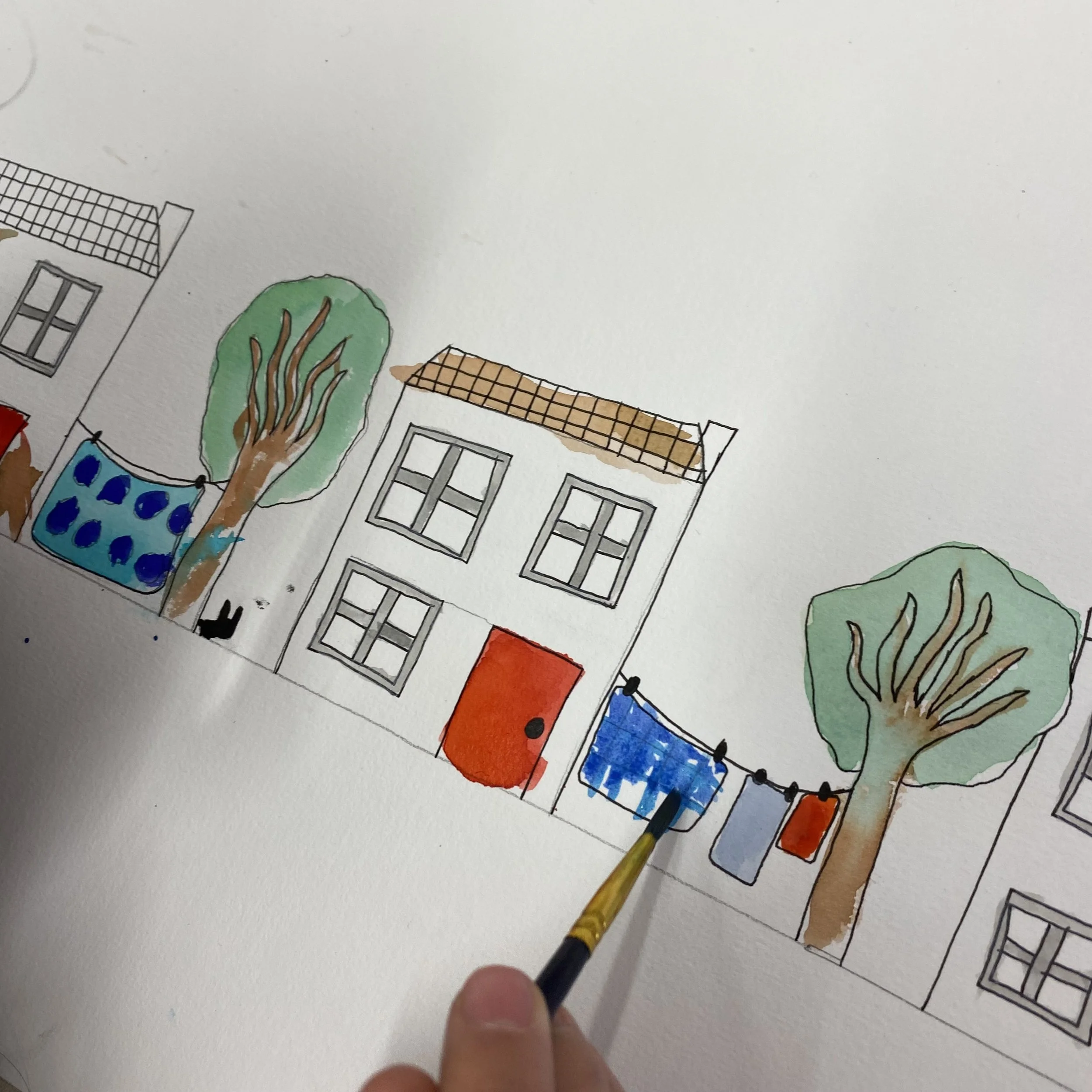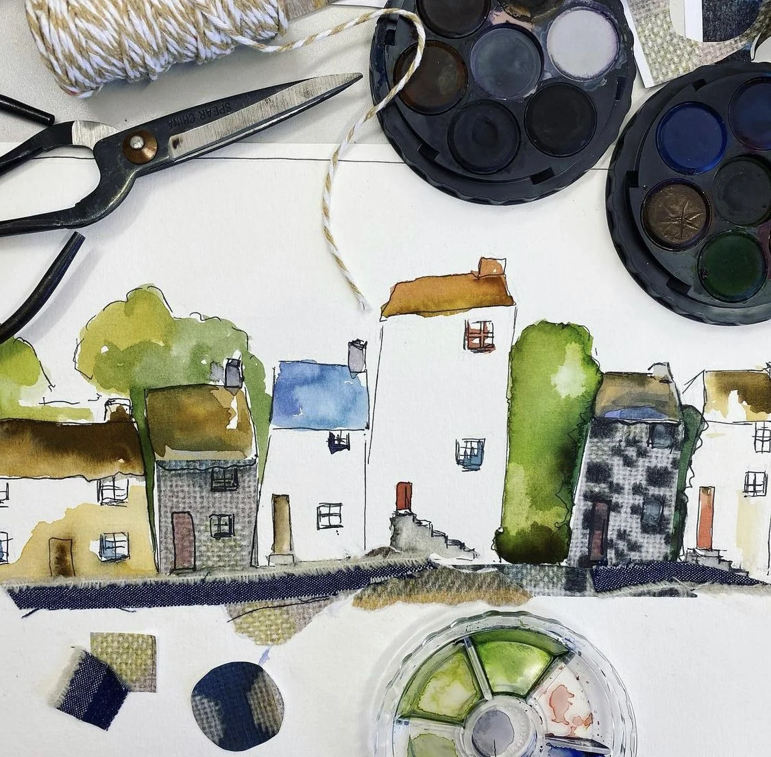 In this friendly, informal workshop, you’ll create rows of tiny Welsh terraced houses using simple watercolour, collage and mixed media. We’ll begin learning how to draw these familiar Welsh terraces step by step. You’ll then paint your scene with watercolours before embellishing your artwork with collage papers inspired by traditional Welsh blankets. You may even choose to add touches of woollen fabric to make your piece uniquely your own.
